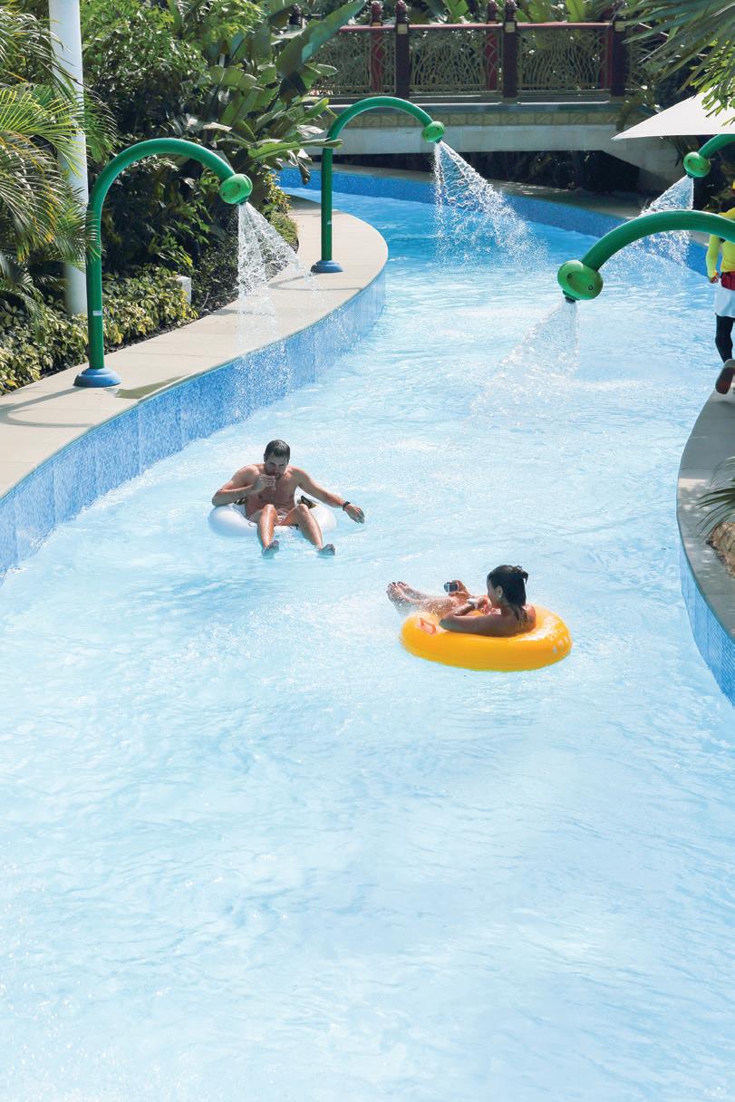 그랜드 리조트 덱에는 세 가지 독특한 시설이 있다. 첫 번째는 스카이 탑 웨이브 풀Skytop Wave Pool. 약 1천명을 수용할 수 있는 세계 최대 규모의 인공 파도 풀장이다. 해안선의 정중앙에서 시작한 파도는 모래해변 가까운 곳까지 힘찬 물결을 만들어낸다. 해변을 따라 조금 걷다 보면 마카오 유일의 워터 슬라이드인 스카이 탑 워터 슬라이드Skytop Waterslide가 등장한다. 동굴처럼 보이는 3개의 워터 슬라이드, 이중 하나는 30미터 길이의 투명한 슬라이드로 설계해 색다른 즐거움이 있다. 그러나 이 두 가지보다 더욱 눈길을 사로잡은 것은 스카이 탑 어드벤처 래피드Skytop Adventure Rapids였다. 575미터라는 세계에서 가장 긴 스카이 탑 라이드로 흐르는 물을 따라가며 백사장이 있는 팜 코브, 미니 폭포와 급류, 간헐천 등을 경험할 수 있는 특급 놀이시설이다.