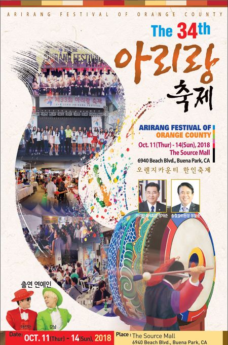 특히 올해 34회를 맞이한 ‘OC아리랑 축제’는 OC한미축제제단과 아리랑축제재단이 합쳐져 OC한인축제재단이란 이름으로 통합해 진행하기로해 주목 받고 있다. ‘다 함께’를 주제로 열리는 이번 행사는 10월 11일부터 14일까지 부에나파크 더 소스몰에서 4일 간 열릴 예정이다.
