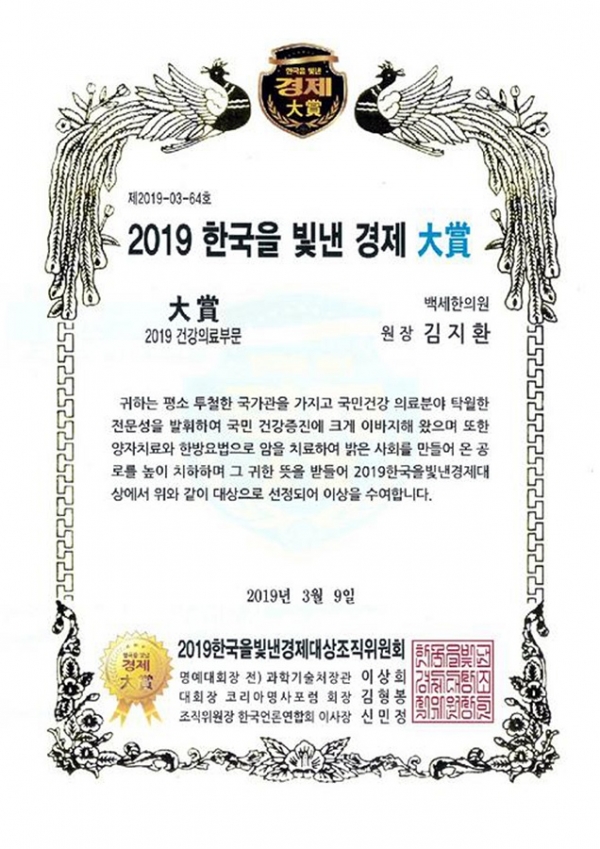 하지만 무작정 원적외선 빛만 쏘인다고 환자들이 다 치료되는 것은 아니다. 우선 환자들에 대한 정확한 진단이 필요하다. 백세한의원에 있는 면역상태 측정 장비는 여기에서 매우 중요한 역할을 한다. 우선 암 환자의 백혈구, 적혈구, 혈소판을 측정하게 되고 교감신경과 부교감 신경의 균형을 측정한다. 백혈구를 통해서는 면역 및 염증의 상태를 측정하는 것은 물론이고 적혈구를 통해 환자의 체력까지 판단할 수가 있다. 더불어 혈소판을 자세하게 들여다보아 간과 골수의 기능까지 예측할 수 있다. 이런 다양한 사전 검사를 통해서 환자에게 최적화된 맞춤 치료를 한다는 것이다. 놀라운 치료 효과 덕분에 김지환 원장은 ‘2019 한국을 빛낸 경제대상’에서 건강 의료부문 대상을 수상하기도 했다.