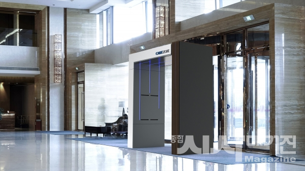 “저희 케어존 에어 샤워 소독기는 무결점 반도체 공정인 클린룸을 바탕으로 특허기술이 적용된 일체형 이동식 소독기입니다. 건물 출입구에 설치하면 세균과 바이러스를 효과적으로 제거할 수 있으며 완벽에 가까운 생활방역이 가능합니다. 특히 플라즈마를 이용하는 것이 다른 회사 제품과의 차별점이며, 현재 국내는 물론 해외에서도 구입요청이 쇄도하고 있어 짧은 기간 안에 K방역의 위상을 널리 알리고 있습니다.”