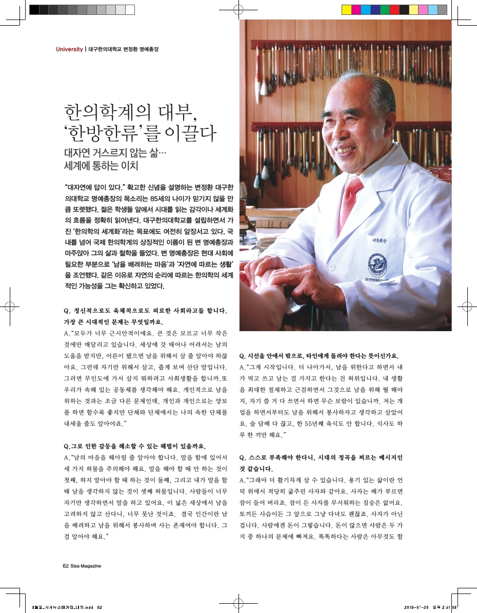 대구한의대학교 변정환 명예총장, 한의학계의 대부, '한방한류'를 이끌다