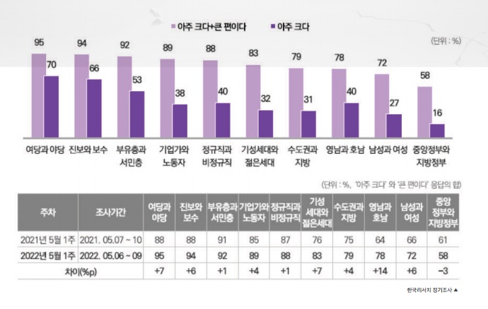 그러나 당장 한국 사회에서 이러한 변화는 쉽지 않을 것으로 보인다. 사회적 갈등은 점점 더 심화되고 있다는 것이 국민의 인식이기 때문이다. 지난 5월 말 한국리서치는 전국의 만 18세 이상의 남녀 1,000명을 대상으로 ‘집단별 갈등인식조사’를 했다. 이에 따르면 ‘여야 갈등이 크다’와 ‘큰 편이다’라는 응답이 무려 95%에 이르렀다. 이에 진보와 보수의 갈등에 대해서는 94%, 기업가와 노동자에 대해서는 92%, 정규직과 비정규직간에 대해서는 88%가 갈등이 크다고 답했다. 모든 갈등의 종류에 대해서 80~90%를 웃돈다는 것은 놀라운 일이 아닐 수 없 다.