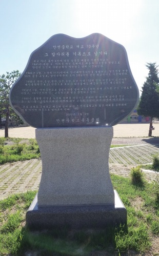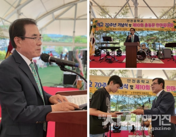 안천중학교는 1945년 해방 직후 무정부상태의 혼란이 계속되는 가운데 한원종 선생이 마을 사랑방을 야학당으로 개조하고, 학생들에게 중학교 과정을 가르치면서 시작되었다. 처음에는 10명 정도의 적은 인원이 모여 공부 했지만, 점점 학생수가 늘어나 50여 명이 되었고 이후 안천 초등학교 방과 후의 교실을 빌려서 수업을 진행했 다. 그 이후 1971년 2월 20일 드디어 12학급으로 증설되고 이와 함께 고등학교도 개설되면서 정식으로 운영되 기 시작했다. 이런 오랜 역사를 가진 안천중학교이기에 이번 70주년 행사는 무엇보다 뜻깊은 행사라고 할 수 있다.