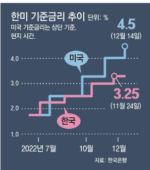 이러한 상황이 장기간 지속하면 더 높은 수익률을 좇아 외국인 투자자금이 유출되고 원화 가치가 하락할 가능성이 있다. 원화 약세는 수입 물품 환산 가격을 높여 인플레이션까지 부추길 우려가 있다. 연준의 이번 조치 이후 실제로 미 달러화 대비 원화(원달러) 환율과 물가가 더 뛰거나 외화가 크게 유출 조짐을 보이면 금통위가 내년에 빅 스텝에 나설 가능성도 그만큼 커질 전망이다.