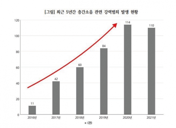 아파트 층간소음은 매우 위험한 범죄의 요소가 되었다. 단순히 자제를 부탁하고, 죄송하다며 머리를 조아리며 해결될 수 있는 문제가 아니다. 최근 10년간 층간소음으로 인해서 17건의 살인이 발생했고 45건의 살인미수가 생겼다. 방화, 강간, 상해, 협박, 폭행도 다반사다. ‘이게 사람까지 죽일 일인가?’라는 반문이 들기도 하지만, 정작 당사자들에게는 매우 심각한 문제로 다가간다. 최근에는 ‘벽간소음’도 문제가 되고 있다. 옆집, 혹은 옆방에서 들리는 소음으로 인해서 사람이 참을 수 없는 지경이 된다. 지난해 초에는 소음으로 옆집에 살던 40대 남성을 목졸라 살해한 사건까지 있었다.
