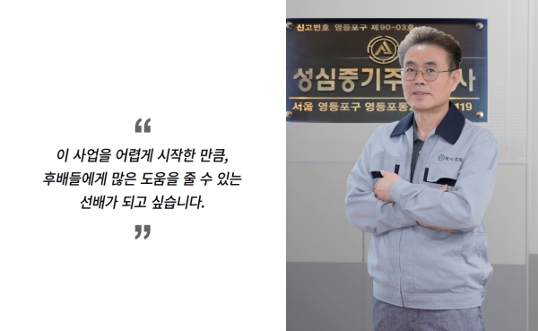이후 대성중기 관리부, 에버다임 관리부에 근무 후 1998년 성심중기를 매입해 현재까지 대표이사로 활동하고 있다. 또한 현재 (주)마이건설중기, 청계중기(주), 공인건설기계(주), 진영건설기계(주) 등 4개의 자회사를 가지고 있다.