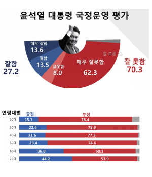 리얼미터가 에너지경제신문 의뢰로 지난 7∼11일(공휴일인 9일 제외) 나흘간 전국 18세 이상 유권자 2천9명을 대상으로 한 조사(95% 신뢰수준에 표본오차 ±2.2%포인트) 결과, 윤 대통령의 국정 수행 긍정 평가는 25.8%였다. 역시 ‘정부 출범 이후 최저치’다.