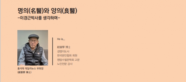 명의는 자기의 학문적 연구를 위하여 환자를 마치 자신의 공부에 실험 도구인 양 여러 가지 처방으로 질병의 반응을 관찰하고, 그 결과를 연구지에 발표하면서 의사로서의 명성과 권위를 얻는다. 반면에 양의는 그렇지 않다. 의사가 배운 지식과 가진 의술로서 환자의 고통을 치유하고 고치는 데만 역점을 둠으로써 환자들의 존경을 받는 의사를 양의라 할 수 있다. 그렇다면 이경근박사는 분명 양의(良醫)에 속하는 존경받는 의사이시다.