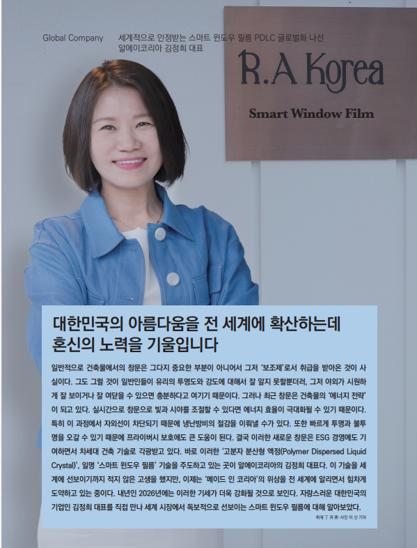 국내 기술 기반으로 개발된 스마트필름 ‘아이온 PDLC’가 건축용 지능형 글라스 솔루션으로 주목받고 있다. 이 제품은 고분자 분산형 액정(Polymer Dispersed Liquid Crystal) 구조를 기반으로, 전기장을 가하면 내부의 액정 입자가 빠르게 정렬되며 빛을 투과시키고, 전원을 차단하면 입자가 다시 무질서하게 퍼지며 빛을 산란시키는 방식이다. 이 전환 과정은 0.1초 이내에 완료되며, 스위치나 센서, IoT 제어만으로도 유리창을 블라인드처럼 빠르게 개방하거나 차단할 수 있다는 점이 특징이다. 알에이코리아는 원료 개발부터 설계, 분산 공정, 롤투롤 코팅, 적층 봉합까지 전 과정을 자체 플랫폼에서 수행하고 있다. 글로벌 PDLC 시장에서 원재료를 수입해 단순 라미네이팅·브랜딩하는 방식이 주류를 이루는 가운데, 전 공정을 국내에서 처리하는 것은 매우 이례적인 사례이다. 이를 기반으로 자동차용 고내열 필름, 컬러 변조 필름, 선택 편광형 필름 등 차세대 제품군도 개발을 완료하였으며, 현재 서비스 테스트가 진행 중이다. 또한 태양열 차단 기능을 갖춘 Low-E(저방사) 기술을 접목해, 전도·복사·대류 열을 동시에 차단할 수 있도록 구현하였다. 무엇보다 이 제품은 단일 필름만으로 프라이버시 확보, 빛·열 복합 차단, 자외선 99% 및 적외선 80% 차단, 고해상도 리어·프론트 프로젝션 스크린 기능을 동시에 제공할 수 있다. 이에 따라 건축·자동차 분야는 물론, 가전제품·가구 등 다양한 생활제품으로 적용 범위를 확대할 가능성도 엿보이고 있다. 이러한 놀라운 가능성으로 인해 지난 6월 10일 사우디아라비아 알울라 왕립위원회(RCU) 대표단이 알에이코리아 홍보관을 공식 방문하기도 했다. RCU는 무함마드 빈 살만 왕세자가 주도해 설립한 전략 기관으로 사우디 정부의 미래도시 사업인 ‘알울라 스마트시티’에 대한 기술 협력 차원에서 이루어졌다. 이러한 방문은 향후 알에이코리아의 중동 진출에 청신호를 보내고 있다. 김정희 대표의 말을 직접 들어봤다.