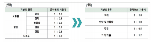 굴착 공사시 안전을 위하여 2023년 11월 산업안전보건기준에 관한 규칙 제339조(굴착면의 붕괴 등에 의한 위험방지) 1항 ‘굴착면의 기울기 기준’ 이 개정되어 상단 굴착폭이 약 2배가 증가되는데 이로 인하여 도로점용 인허가 문제, 토공 및 포장공 증가, 가시설 설치 필요, 시민불편 증대 등 문제점이 발생되고 있다.