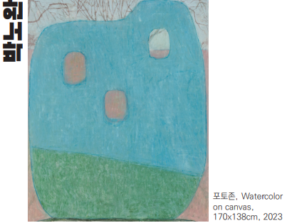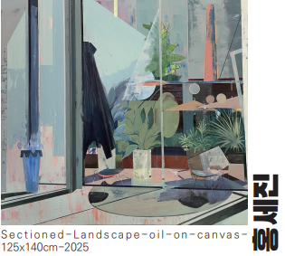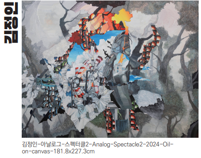 그는 자신의 기억을 뒤섞어 그림으로 표현한다. 그는 일부러 연관 없는 사진이나 풍경, 기억의 이미지들을 캔버스 위에 콜라주처럼 펼쳐 놓는다. 쉽게 읽히지 않는 이 구조는 오히려 관객으로 하여금 더 오래 그림 앞에 머물게 만든다. 김정인은 작업을 통해 현실을 다시 조율하고 배열한다. 그는 “예술은 자유로운 생각에서 출발하지만 결국 전시나 판매 같은 현실의 틀 안에서 살아남아야 하는 어려움이 있다”고 털어놓는다. 그럼에도 붓을 놓지 않는 이유는, 그림을 그리는 행위가 “어지럽고 해석되지 않는 현실의 파편들을 다시 배치하며 나만의 질서와 리듬을 찾아가는” 과정이기 때문이다.