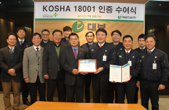 대보건설이 중견 건설사 최초로 한국산업안전보건공단으로부터 안전보건경영시스템인 ‘KOSHA 18001’ 인증을 획득했다. 대보건설은 20일 서울 수서동 본사 대회의실에서 김동춘 한국산업안전보건공단 기술이사로부터 KOSHA 18001 인증서를 받았다. KOSHA18001은 공단이 국내 기업의 실정에 맞춰 자율적 안전보건 및 재해예방활동을 선진국 수준으로 향상시키기 위해 직접 개발, 운영 중인 경영관리 인증시스템으로, 본사 및 현장의 활동수준과 경영진 면담 등 까다로운 심사를 통해 인증을 부여하고 있다. 경영진 및 임직원 모두가 안전관리에 전사적 역량을 집중해 온 대보건설은 스마트폰 앱(App)을 활용한 스마트위험성평가를 실시하는 등 체계적인 현장 안전관리시스템을 구축해 왔다. 특히 2014년 세월호 참사 이후부터 KOSHA 인증 취득을 준비해 지난해 4월 인증 신청 후엔 1년 7개월 동안 △실태심사 △시스템 입문교육 △본사 및 현장컨설팅 △시스템 교육 및 전파 △예비심사 △현장 인증심사를 거쳤다. 공단 관계자는 “대보건설이 중견 종합건설사가 가운데 최초로 인증을 획득해 의미가 남다르다”며 “향후 이 인증이 대형사 위주에서 중견 건설사로 확대되는 데 기여할 것으로 기대된다”고 밝혔다. 정광식 대보건설 대표는 “현장의 재해는 기업뿐 아니라 국가와 개인에게도 막대한 인적, 물적 손실을 발생시키는 만큼 안전관리는 경영의 필수 요소가 되고 있다”며 “그동안 쌓아 온 탄탄한 기술력에 국제적 수준의 안전관리시스템을 더함으로써 내실있는 중견 건설사로서의 입지를 확고히 해 나갈 계획이다”고 강조했다.