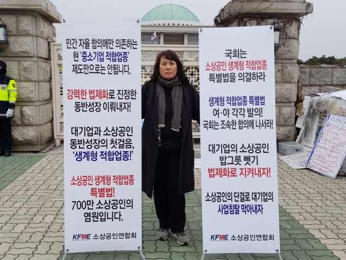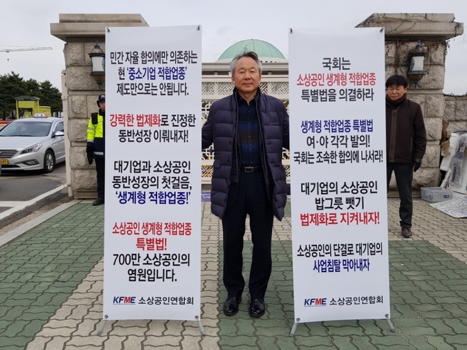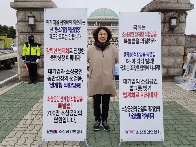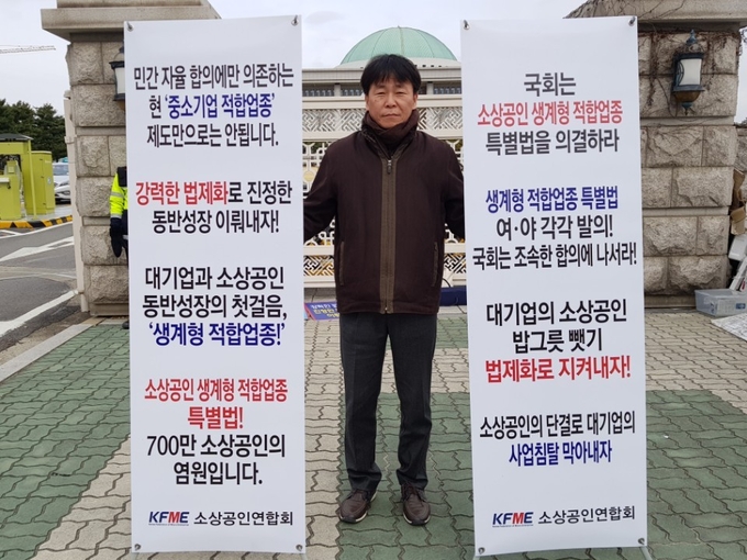 소상공인연합회(회장 최승재)는 국회의 조속한 ‘소상공인 생계형 적합업종 특별법’ 제정을 촉구하는 국회앞 릴레이 1인 시위를 이어갔다.