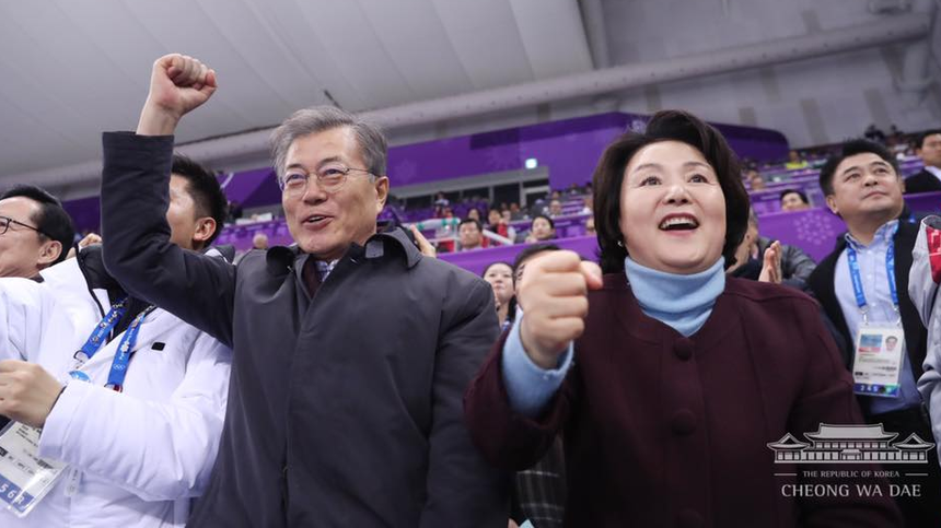 문재인 대통령과 김정숙 여사는 17일 오후 7시부터 쇼트트랙 여자 1,500m예선을 시작으로 쇼트트랙 남자 1,000m 결승까지 약 2시간 30분간 아이스아레나 경기장에서 선수들을 응원했다.