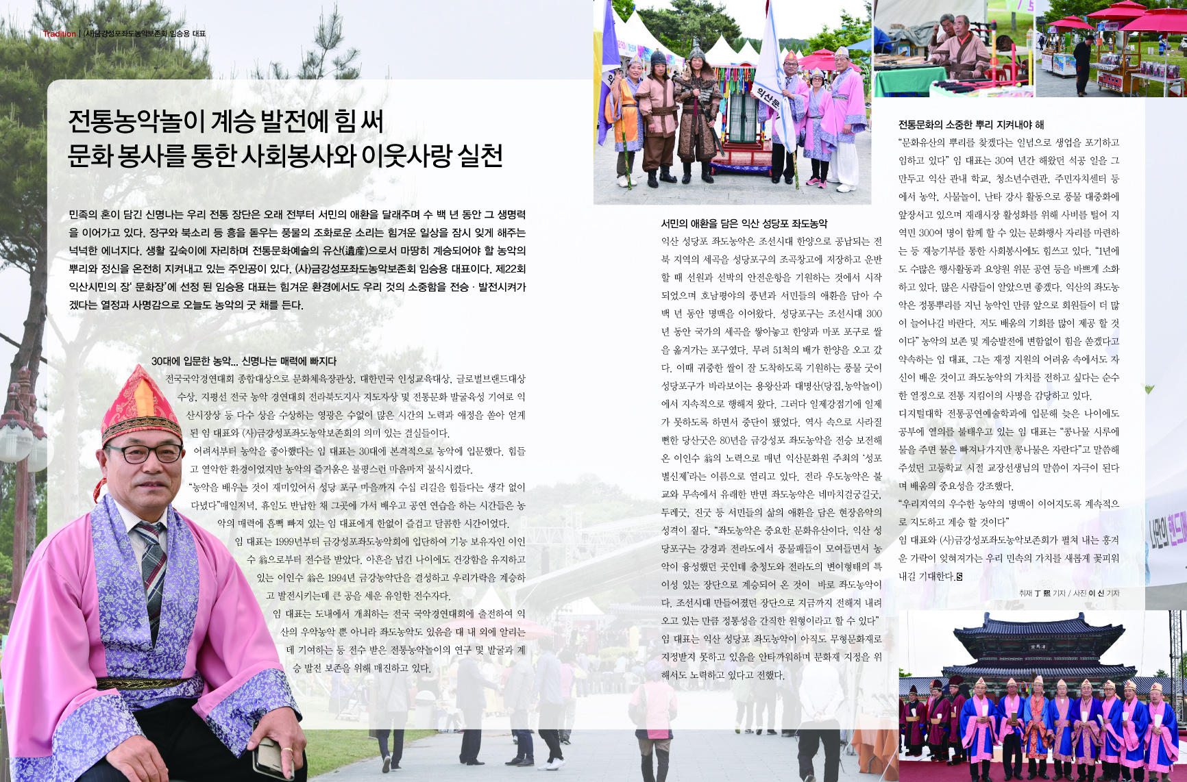 많은 사람들이 알았으면 좋겠다. 익산의 좌도농악은 정통뿌리를 지닌 농악인 만큼 앞으로 회원들이 더 많이 늘어나길 바란다. 저도 배움의 기회를 많이 제공 할 것이다” 농악의 보존 및 계승발전에 변함없이 힘을 쏟겠다고 약속하는 임 대표, 그는 재정 지원의 어려움 속에서도 자신이 배운 것이고 좌도농악의 가치를 전하고 싶다는 순수한 열정으로 전통 지킴이의 사명을 감당하고 있다.