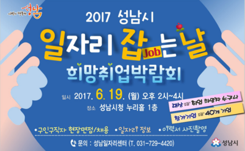 성남시는 오는 6월 19일 오후 2시~4시 시청 1층 로비에서 희망취업박람회를 연다고 밝혔다.시는 이날을 ‘시민 일자리 잡는 날’로 운영해 40개사에 117명 취업을 지원한다. 구인 업체로 참여하는 기업은 ㈜엘엔씨바이오, 라치오날코리아㈜, ㈜시스텍, ㈜지오네트 등이며, 업종은 제조업, 무역업, 건설업, 서비스업 등 다양하다.
