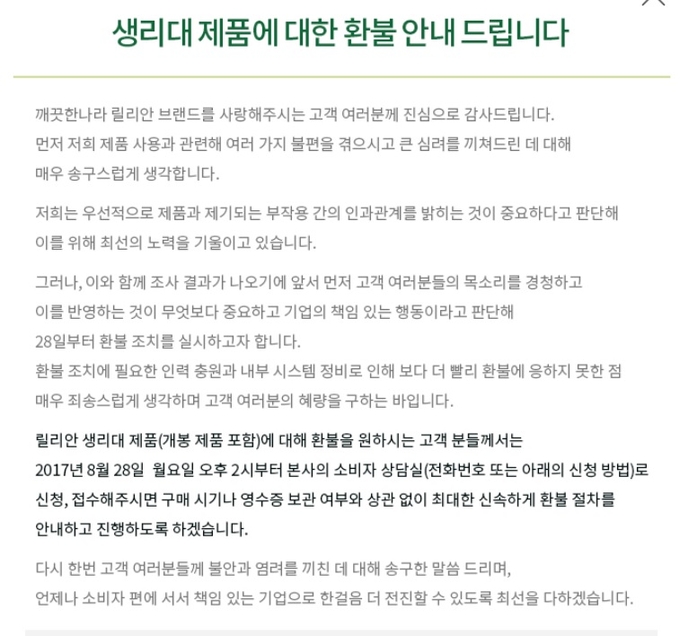 부작용 논란이 제기됐던 릴리안 생리대 제조업체 깨끗한 나라가 지난 28일부터 환불 신청을 받기 시작했다. 하지만 지나치게 낮은 가격과 번거로운 절차로 인해 소비자들의 원성을 사고 있다.