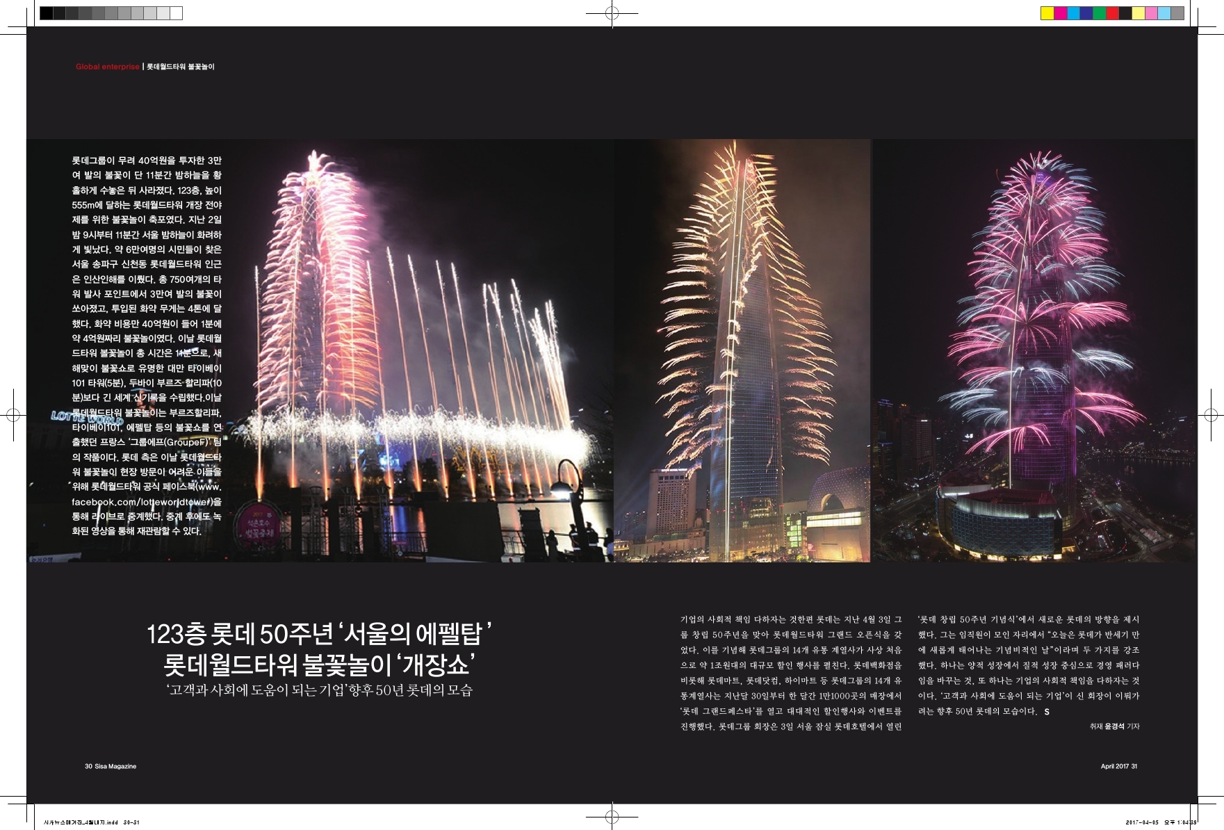 Global enterprise 롯데월드타워 불꽃놀이 123층 롯데 50주년 '서울의 에펠탑'